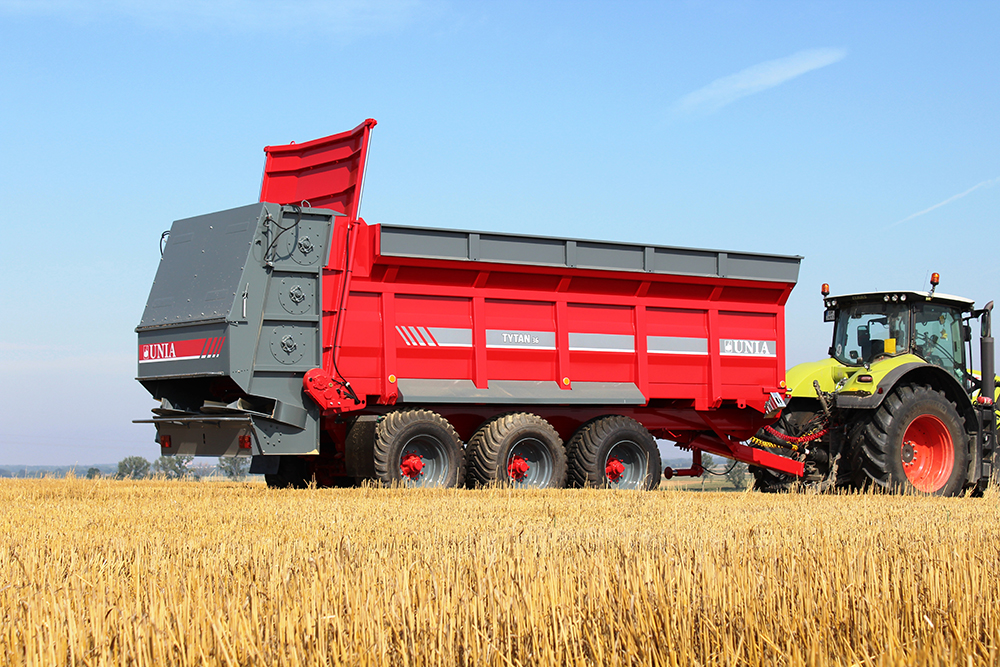 Andere Möglichkeit für Kalkausstreuung auf großen Ackerflächen ist die Ausbringung mit einem Miststreuer, der einen horizontalen Adapter und Streuteller hat. Unser bester Vorschlag ist Miststreuer TYTAN 36 mit 3-Walzen horizontal-Adapter und Streutellern. Die Maschine hat eine Tridem-Achse. Damit Fahrkomfort und Arbeitssicherheit besser werden, ist die erste und dritte Achse lenkbar und selbsteinstellend. Die Achsen und die untere Standarddeichsel sind gefedert. TYTAN 36 hat 2 Förderer, die sich parallel gegenüber verschieben. Jeder Förderer hat 2 Rundgliederketten, die mit Leisten verbunden sind.