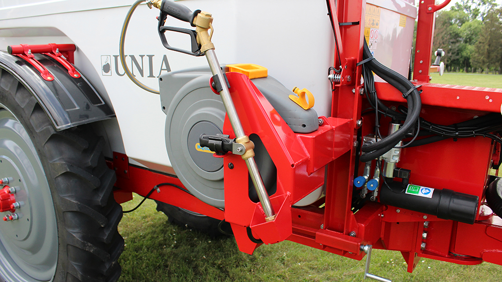 Myjka zewnetrzna opryskiwacza Lanca pistoletowa z wężem 20 mb (w bębnie samozwijającym), umożliwia wygodne i bezpieczne dla operatora oraz środowiska naturalnego, umycie z zewnątrz maszyny bezpośrednio na polu |