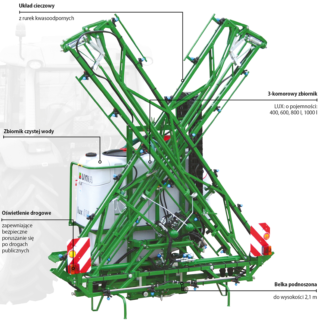 LUX опрыскиватель комфортабельный узнаваем по характерным сборке облегченной конструкции штанги и в результате малой общей массой. | Складывание штанги проводится гидравлическим способом – симметрически двумя цилиндрами и подсоединенными к ним тягами, которые складывают последние крылья штанги. | Компьютер SPRAY. Автоматическое поддержание дозы опрыскивания независимо от скорости движения. Для резервуаров от 800 л – 3-камерных. Требует электромагнитного клапана. | NAVI–GPS. Делает возможным автоматическое включение секций полевых штанг и создание виртуальных проездных дорожек на основе сигнала GPS как в навесных опрыскивателях, так и в прицепных. Преимуществом этого решения является быстрое подключение к компьютеру SPRAY и возможность использования навигации во время работы с другими механизмами, такими как: оборудованные агрегаты или разбрасыватель удобрений. Исключительно для компьютерa SPRAY. |